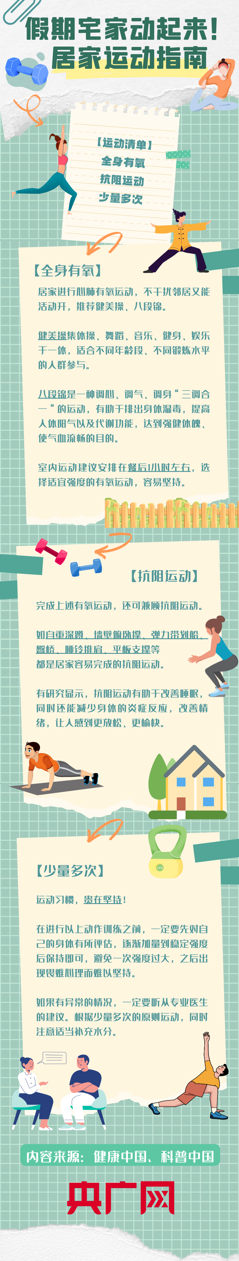 央广网北京10月4日消息(记者 郭彦伟 实习记者 熊峻渝)国庆假期,出游的人不少,“宅”在家里的人也不少。温馨提示:假期宅家,可别让舒适的沙发和温暖的被窝“困住”活力,这份居家运动指南请查收!