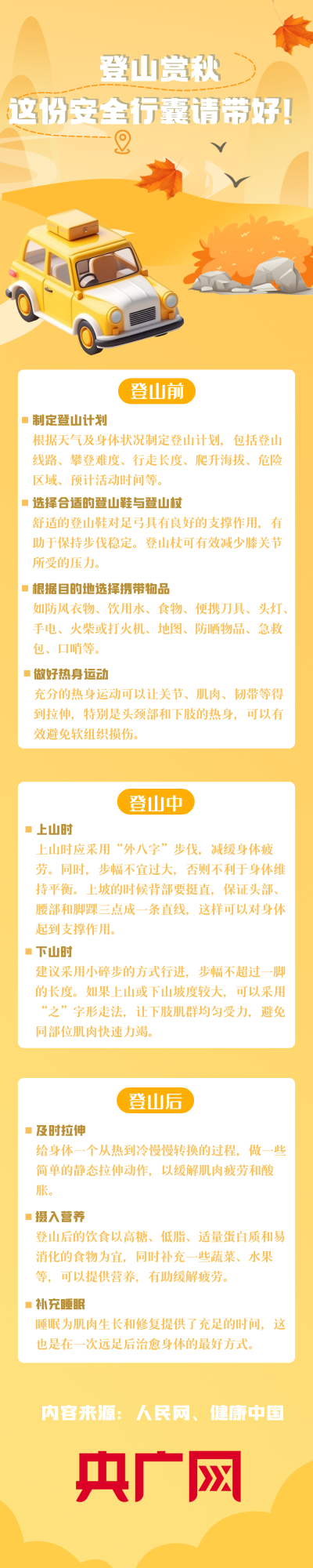 央广网北京10月5日消息(记者 郭彦伟 实习记者 毛静)金秋时节,山色如画,正是登高赏景的最佳季节。一场安全又尽兴的登山之旅,离不开周全的准备——您的“安全行囊”已就位,速来领取!戳下图↓