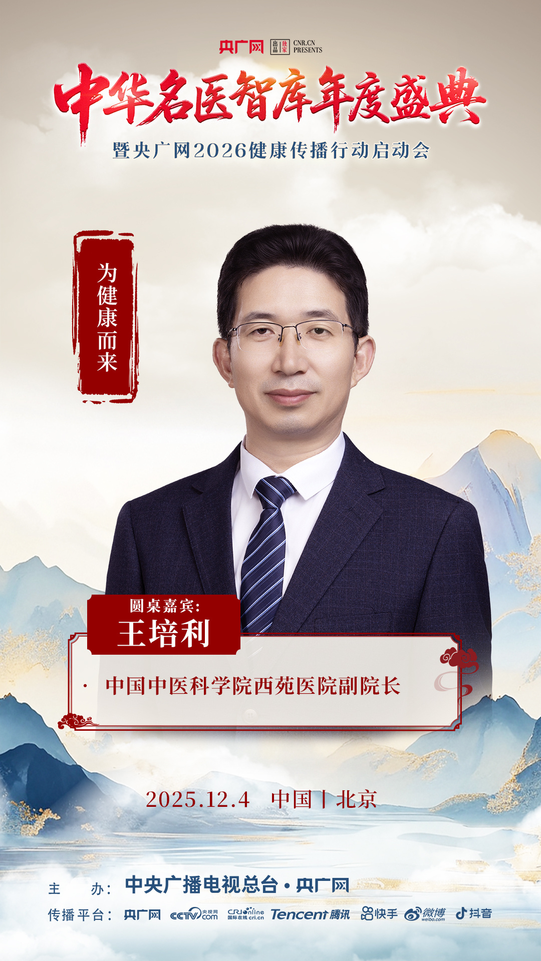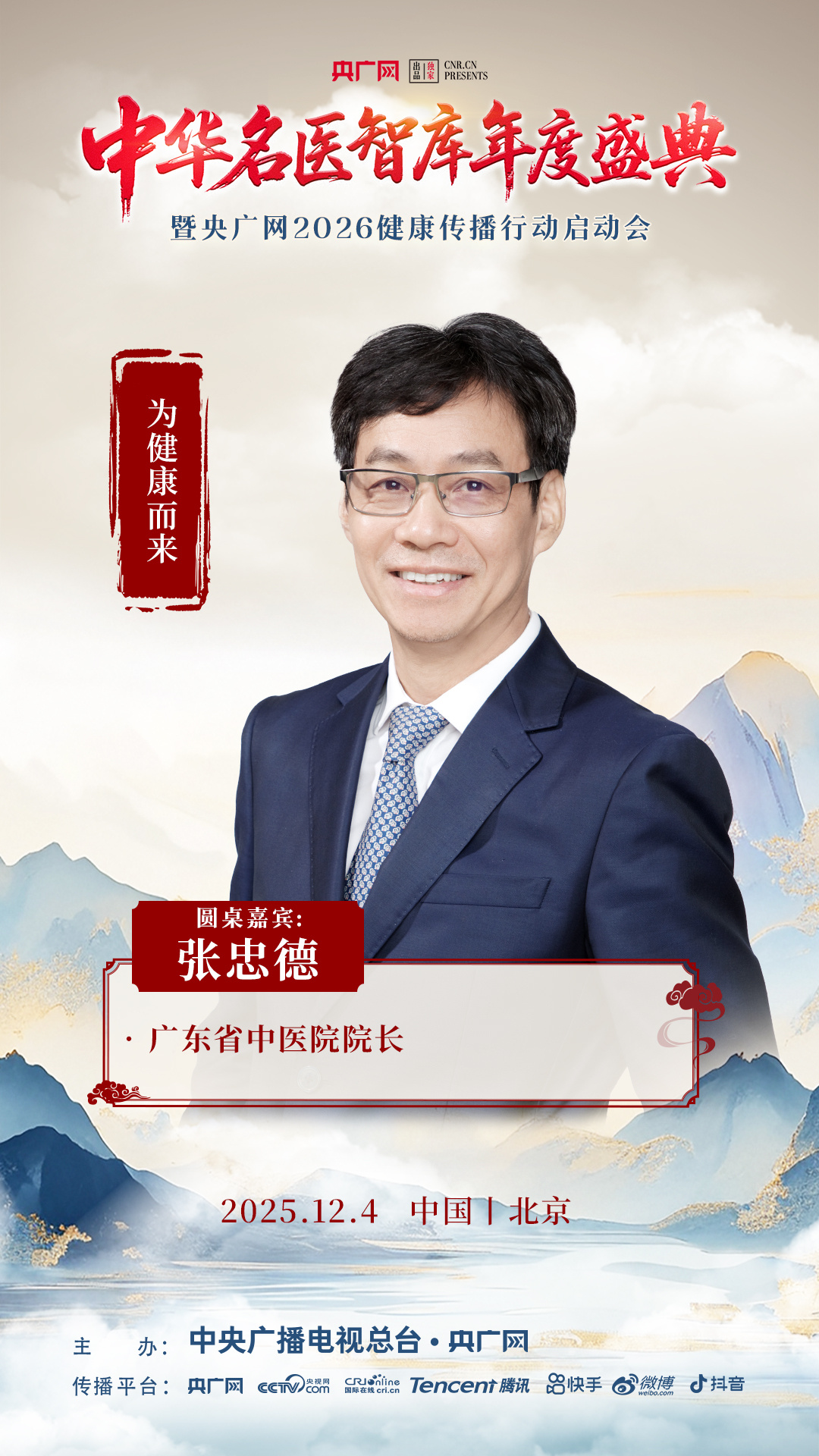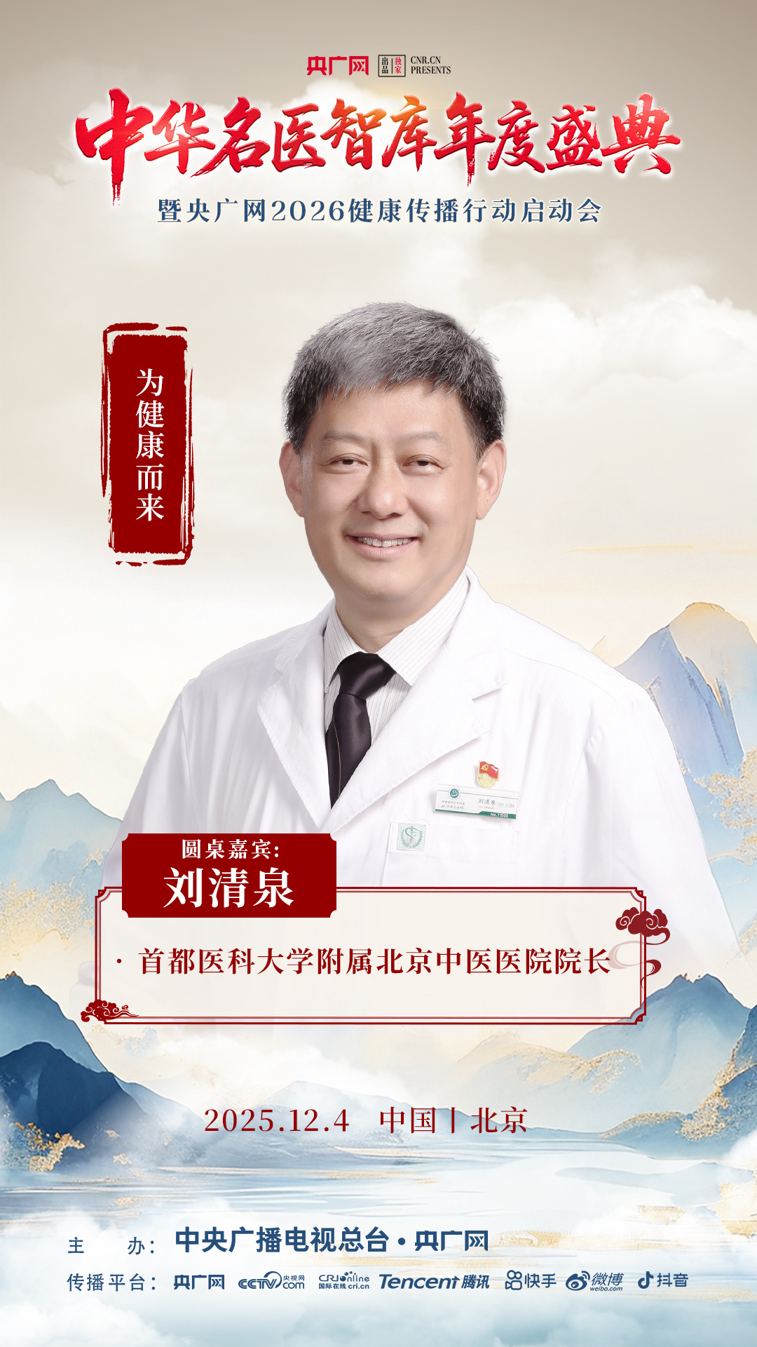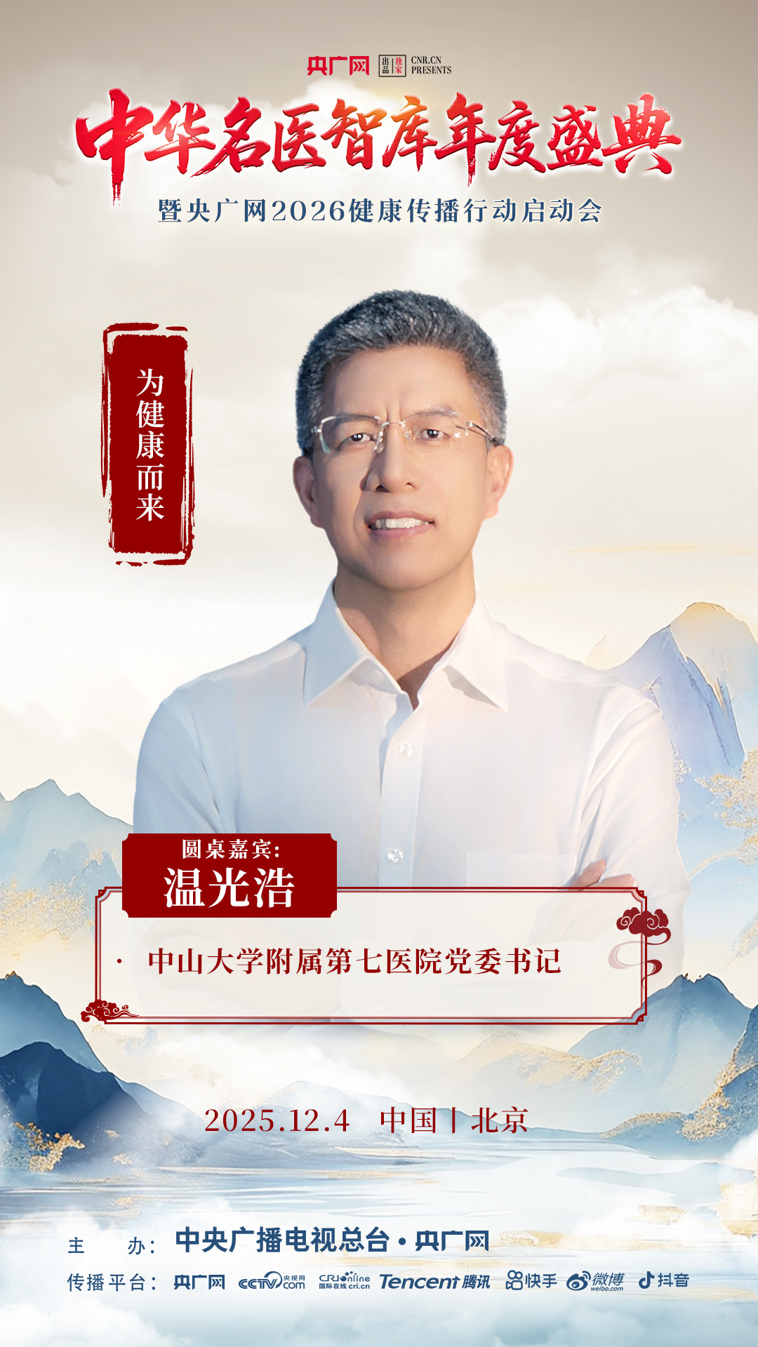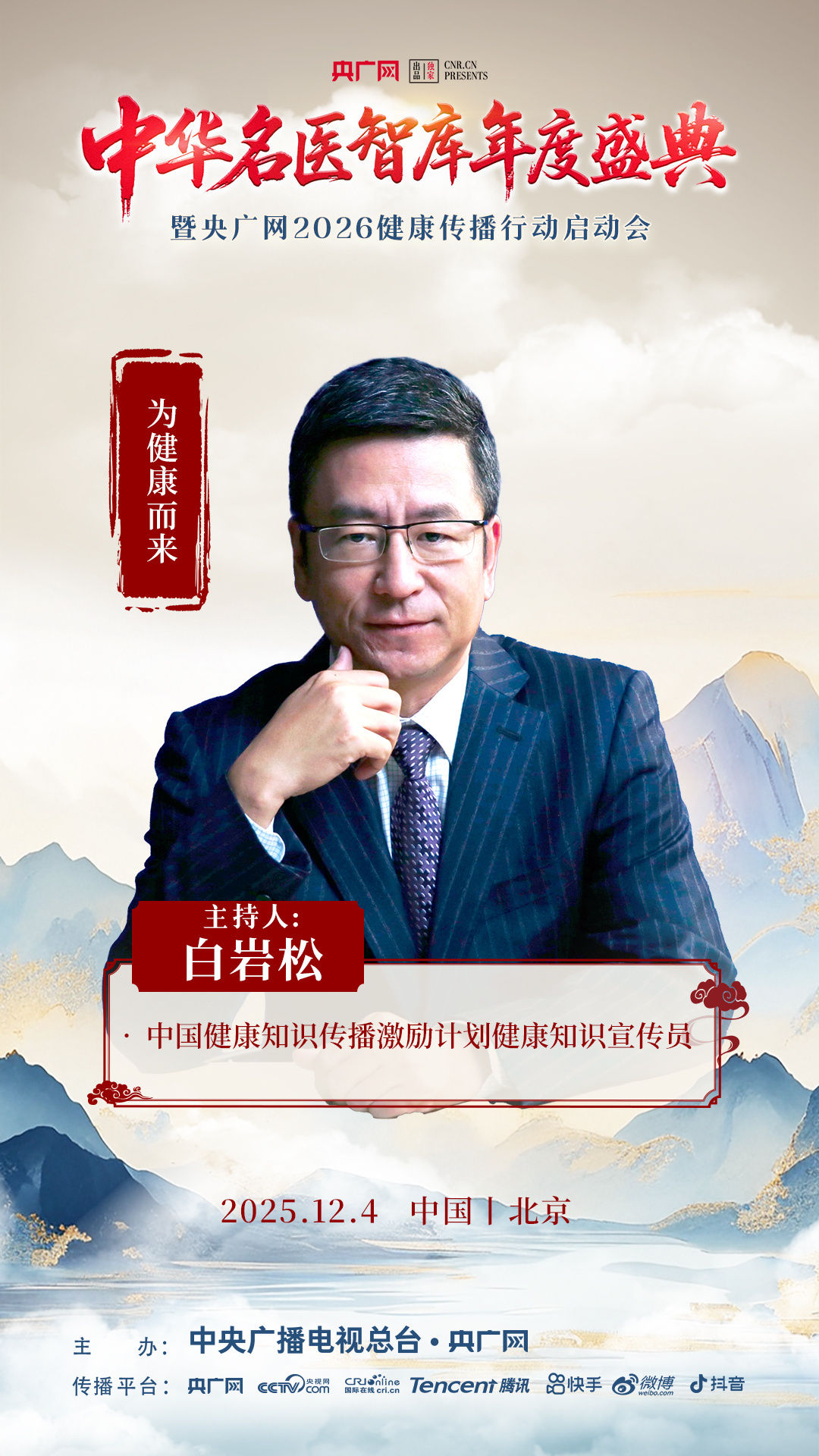 12月4日上午9点,相约北京,共赴“中华名医智库年度盛典暨央广网2026健康传播行动启动会”。活动将通过央广网客户端、抖音、快手、视频号、微博等平台同步直播。