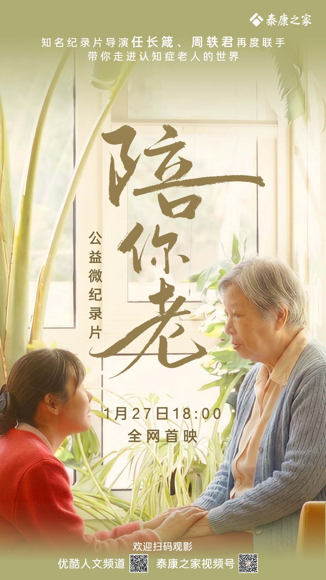 聚焦这一社会议题,泰康之家联合国内知名纪录片导演任长箴、周轶君打造的认知症公益微纪录片《陪你老》将于2026年1月27日正式上线播出。这是两位导演继《学会老》之后,聚焦老年群体的又一力作,依托前作积累的良好口碑与社会影响力,自消息公布以来,该片就引发行业及公众的广泛关注与期待。