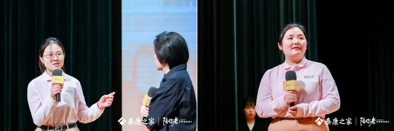 片中的两位护理师代表王悦、青香也来到现场,她们结合亲身经历,分享影片拍摄过程中的感悟与照护认知症长辈的日常。王悦说:“第一是为自己感动,第二是感觉我们从事的这份职业终于能被更多人看见、了解并口口相传,让我们更加觉得,自己坚守的是一份非常有意义的事业。”首映现场,青香再度落泪,她说:“我们真的把长辈当做我们的亲人、家人,就像自己的爷爷奶奶。在泰康之家,我们和长辈们是双向奔赴,他们非常相信我们,我们也有信心一定要把他们照顾得很好,让他们在这里度过开心、幸福地晚年。所以泰康之家给了我生活,给了我信任,给了我爱。”